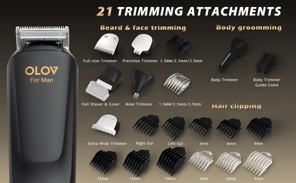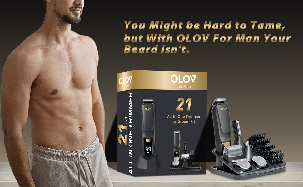 The OLOV® Titan1.0 kit comes with 21 all-in-one pieces, including 5 unique heads and various guards, to meet all your facial and body shaving needs with precision and versatility.