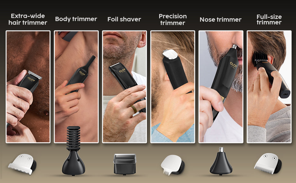 Olov Titan1.0 Trimmer integrates 6 different easy-to-swap trimmer heads with 14 guards (3mm to 19mm). You can groom any type of hair, anytime, anywhere.